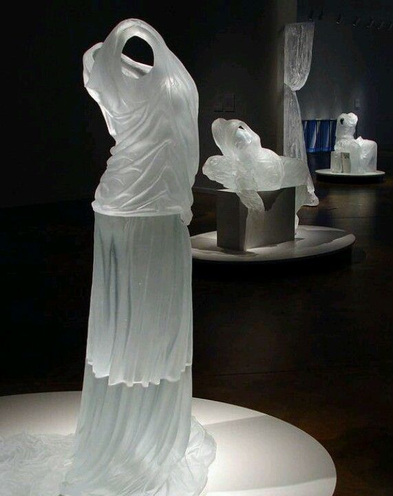 Karen LaMonte is a Czech republic glass artist. Her life-sized sculptures mimic the folds and pleats of material, draped over a female form inside. LaMonte’s anthropomorphosis of the dress is achieved with the hint of the female form beneath the folds. The essence of femininity and sensuality exudes from the sculptures despite the cold medium. She probes the disparity between our natural skin and our social skin, clothing which we use to obscure and conceal, to protect the individual and project a persona. It is a ‘vestmentary envelope’ which renders us as social beings.